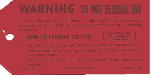 TACHOMETER SENDING UNIT TAG, red, attaches to the wire from the sending unit to the tachometer. $ 3.00. |